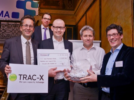 (auf dem Foto sind zu sehen: vorn von links: Dr. Jörg Ritter, BTC Business Technology Consulting AG, Oldenburg, Dr. Ulf Kreienbrock (Vorsitzender des Vereins Zukunft für Kinder e.V.), Harry Smits, Gas Transport Services B.V., Groningen, Markus Wild, ONTRAS – VNG Gastransport GmbH, Leipzig. Im Hintergrund: Dr. Götz Lincke, PRISMA European Capacity Platform GmbH, Leipzig)